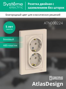 Розетка ATLASDESIGN двойная с заземлением 16А в сборе бежевый