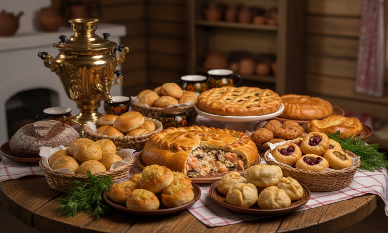 Обилие Выпечки: Русская кухня богата разнообразной выпечкой: пироги, пирожки, блины, оладьи, кулебяки. Сладкие и несладкие пироги с разнообразными начинками являются украшением любого стола.